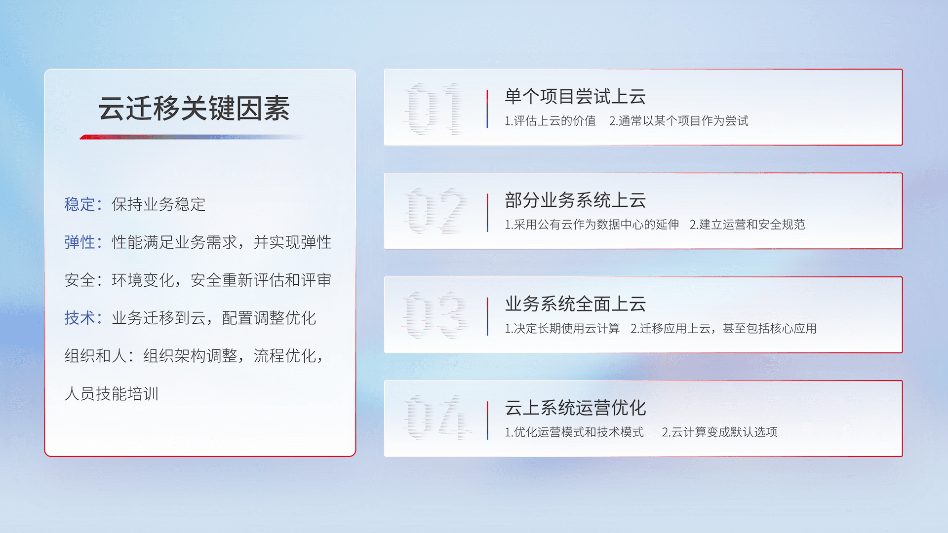 结合实际业务,,,,从规划设计、、、、云平台选型、、、云原生改造、、、、数据迁移、、集成交付,,,,迁移全过程为客户识别最佳上云路径,,,做好风险识别管理,,,设计网络架构、、、身份权限、、、、安全审计合规、、、、操作审计、、日志审计、、监控告警策略、、多站点容灾设计等,,对云上基础设施进行整体规划,,,,提升IT治理水平,,,以满足弹性、、、、高可用、、高性能的需求。。。。